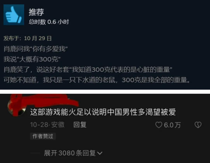 因此,在以“擦边”闻名的真人恋爱影游中,男人真正看到的却并非美女,而是一个理想条件下的自己:“真的破防了,游戏很真实,可我的失败也很真实。感谢这款游戏可以给我带来我这种屌丝梦寐以求的体验,希望再也没有我这样的舔狗。”(摘自《完蛋!》Steam评论区)