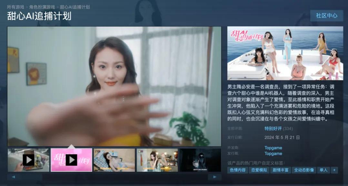 真人恋爱影游《甜心AI追捕计划》(以下简称《甜心》)是其中佼佼者,它于2024年5月21日在Steam平台发售。