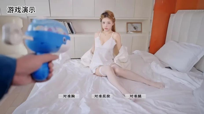 镜头一转,另一名衣着更为清凉的女演员躺在床上,对着玩家做出各种挑逗性的动作,而玩家则手持玩具枪,屏幕下方也恰逢其时的出现了“对准胸”、“对准屁股”等选项文字……