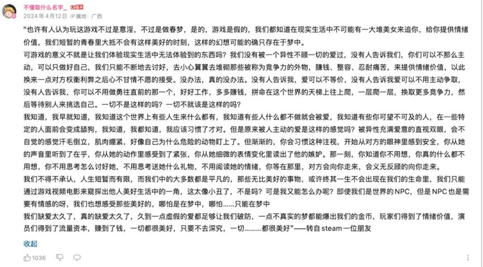 “在国内有很大一部分的普通男生,他们其实长这么大从未感受过被爱,以他们为目标群体的也往往都只有一些自以为是的擦边内容,连资本都从未重视过他们的情感需求——直到这款游戏的出现。当这些胆怯又自卑的男孩子们自嘲为小丑时,佳佳子却站出来坚定地告诉他们‘你们不是小丑’。这一刻,哪怕是谎言,救赎都已完成。”