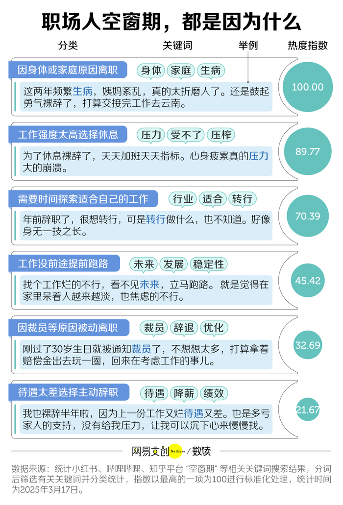 我们也整理了社交媒体上有关“空窗期”的讨论,发现主动离职最常见的原因是身体或家庭。当然了,因工作强度大、内卷严重、看不到职业前景、待遇差等,放弃打烂工干脆跑路的也很普遍。