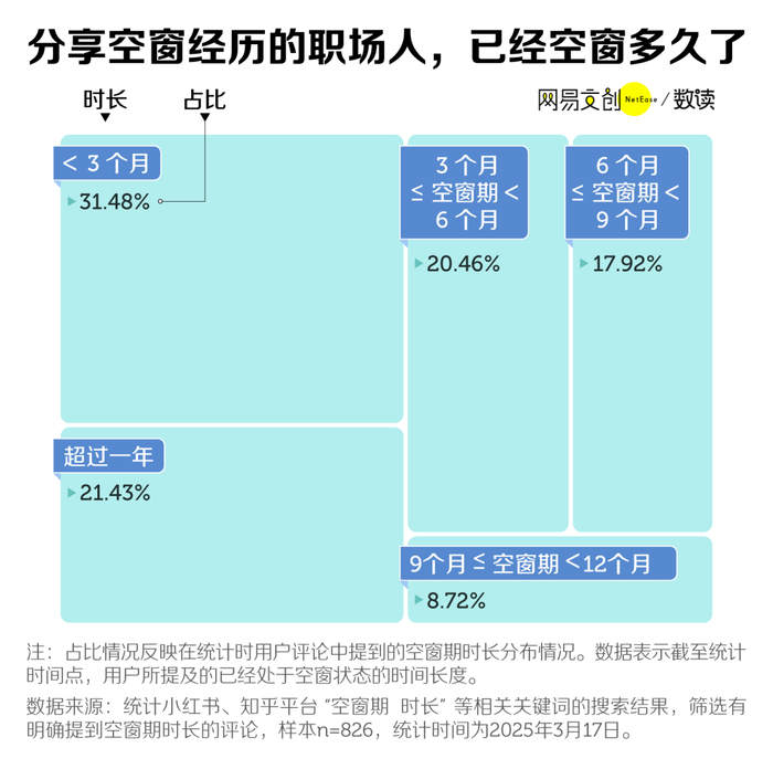 为了更好了解大家职场空窗期持续的情况,我们也对社交媒体上提及时长的讨论进行了统计,结果发现,职场空窗期较长的情况的确不算少见,像超过一年的占比就达到了21.4%。