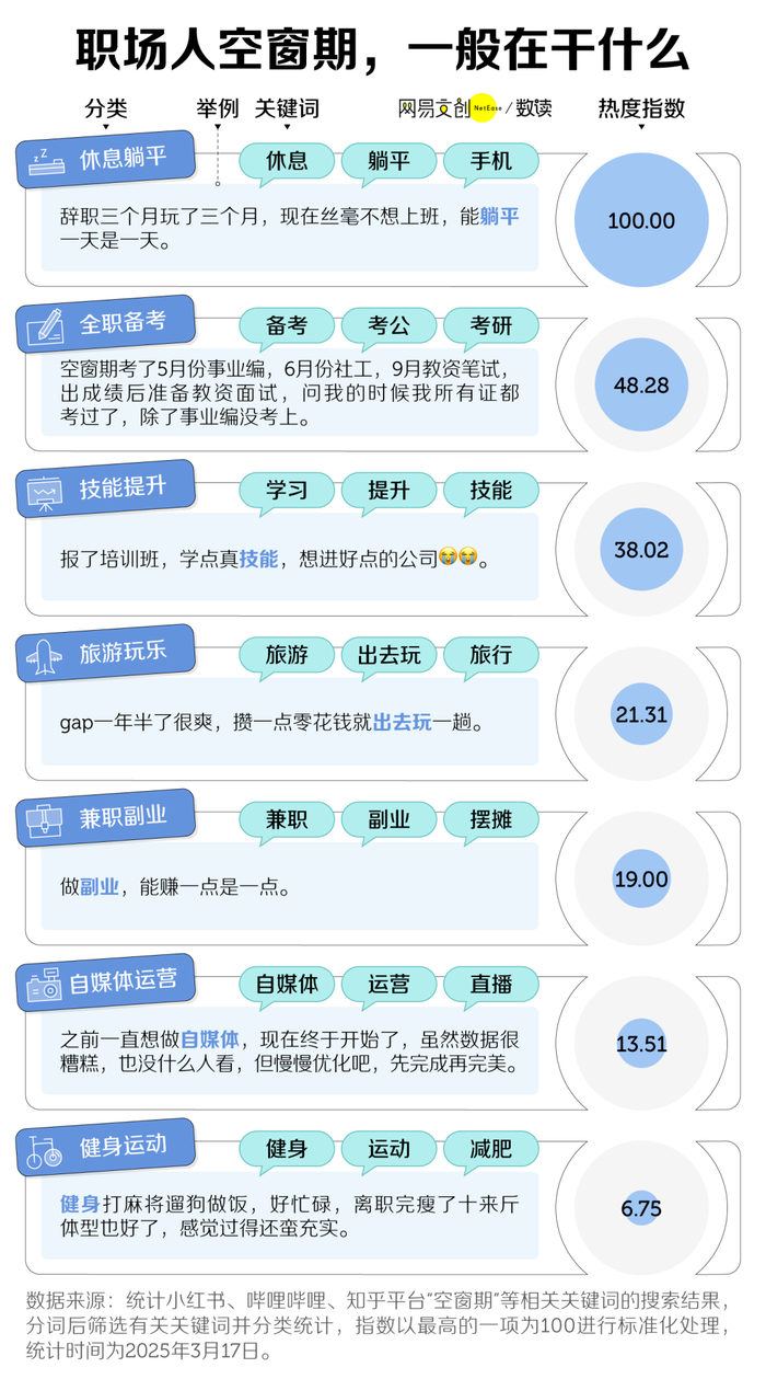 逃离“996”的格子间,进入职场空窗期后,大家都在干什么?我们发现虽然休息躺平是大多数人的主旋律,可离开职场都没能真正放松下来的,也不乏少数。