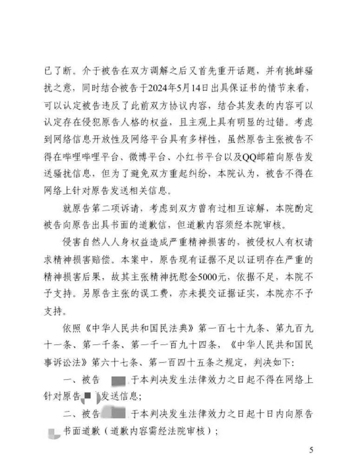 9月11日,法院判决,一、被告于本判决发生法律效力之日起不得在网络上针对原告发送信息;二、被告宋某某于本判决发生法律效力之日起十日内,向原告书面道歉(道歉内容需经法院审核)。