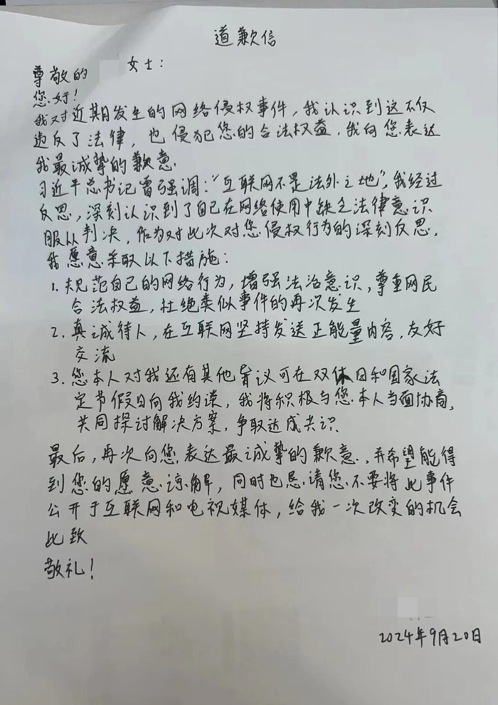 2024年9月的道歉信。图 / 访谈者提供