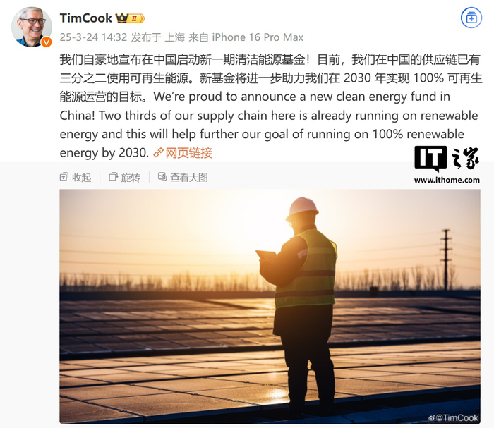 IT之家 3 月 24 日消息,苹果 CEO 蒂姆・库克(Tim Cook)今日在微博发文宣布在中国启动新一期清洁能源基金。他表示:“目前,我们在中国的供应链已有三分之二使用可再生能源。新基金将进一步助力我们在 2030 年实现 100% 可再生能源运营的目标。”