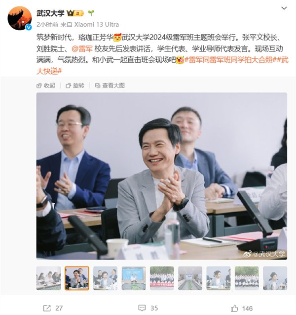 据了解,今天还举行了武汉大学2024级雷军班主题班会,校长张平文、院士刘胜、雷军先后发表讲话,学生代表、学业导师代表发言。