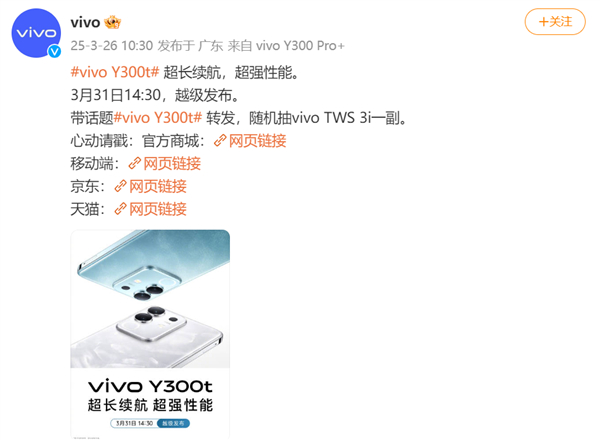 vivo Y300t官宣:主打超强续航和超强性能 3月31日发布