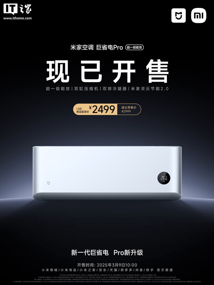 小米米家空调巨省电 Pro 2025 款 3 月 9 日正式开售,支持超一级能效,1.5 匹建议零售价 2999 元,首发价 2499 元。