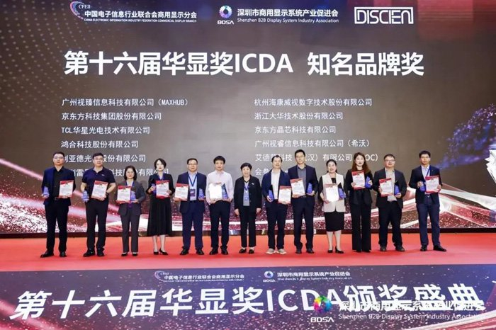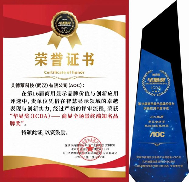 除此之外,本次活动现场还举办了第十六届商显行业“华显奖”颁奖盛典。作为商显行业标杆的的荣誉奖项,“华显奖ICDA”旨在打造商显行业各领域创新优秀企业的标杆,表彰先进典范,助力企业长虹发展。此次AOC斩获第十六届华显奖ICDA-商显全场景终端知名品牌奖,既得益于行业内各大企业、经销商、工程商以及终端客户对AOC品牌的高度认可,更是AOC自身雄厚品牌实力的有力彰显。