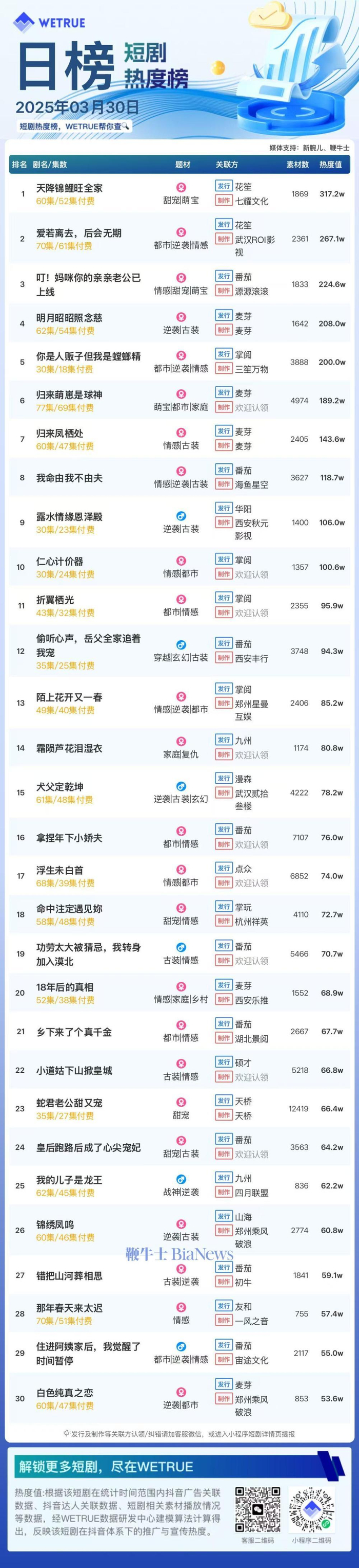 30日短剧热度榜:《天降锦鲤旺全家》第一,大盘热度5961万