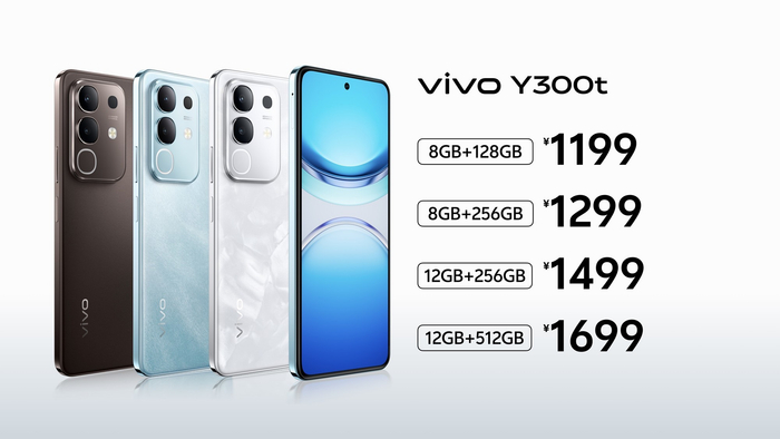 vivo Y300t拥有微四曲后盖与直屏的经典组合,整机外观硬朗精致,共带来岩白、海蓝、黑咖三种配色,并提供四种容量版本供选择,8GB+128GB版本售价1199元,8GB+256GB版本售价1299元,12GB+256GB版本售价1499元,12GB+512GB版本售价1699元。