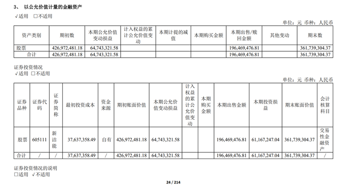 年报显示,上海贝岭持有的新洁能股票本期公允价值变动损益为6474.33万元,公司2024年减持新洁能股票,本期出售金额为1.96亿元,投资损益为6116.72万元。