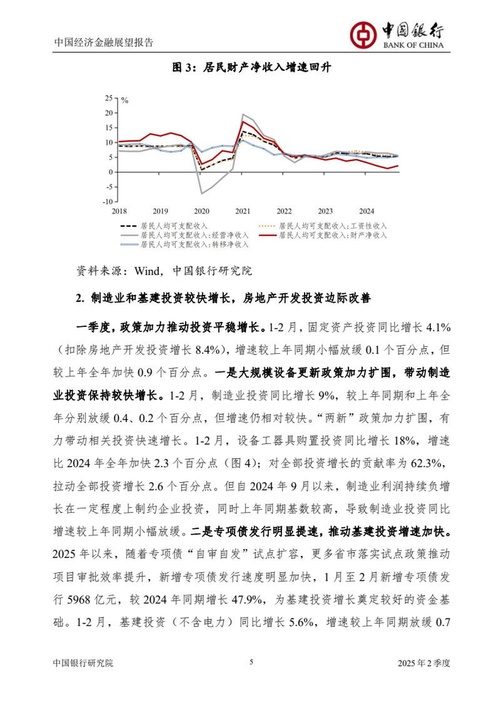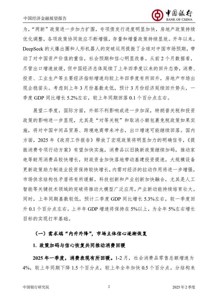 《报告》认为,2025年一季度,中国经济总体延续了上年四季度以来的回升态势,国内宏观政策更加积极有为,存量和增量政策持续显效,内需有所回升,市场预期和信心逐步改善。预计一季度GDP同比增长5.2%左右。