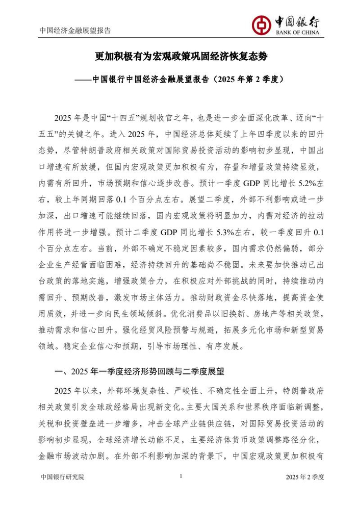中国银行研究院:2025年第二季度中国经济金融展望报告
