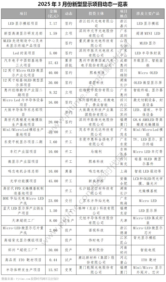 2025年3月份,新型显示项目进入签约、开工、投产热潮。据Pjtime.com不完全统计,本月共有26个LED显示屏、Mini/Micro 显示芯片、Micro-LED封装、LED模组、Micro OLED、智能电视、背光显示模组、车载光学显示、显示终端、显示装备与材料等26个新型显示项目传来最新进展。