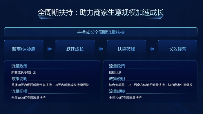 针对新商冷启到跃迁成长的商家全周期经营,快手电商也提供了专项扶持助力。新商冷启计划全年有千亿专属流量,重点针对首播30天到90天内的新商定向扶持与成长提拉。扶摇计划则有全年700亿流量,重点针对商家大场的前中后给予流量扶持,助力商家大场突破。