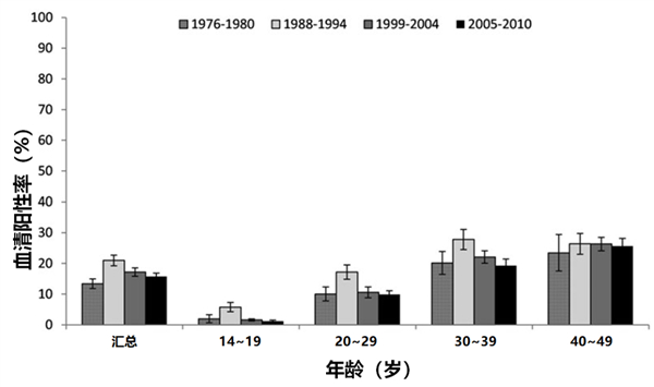 美国人口不同年龄和时期的 2 型单纯疱疹病毒血清阳性率。图片整理自参考资料