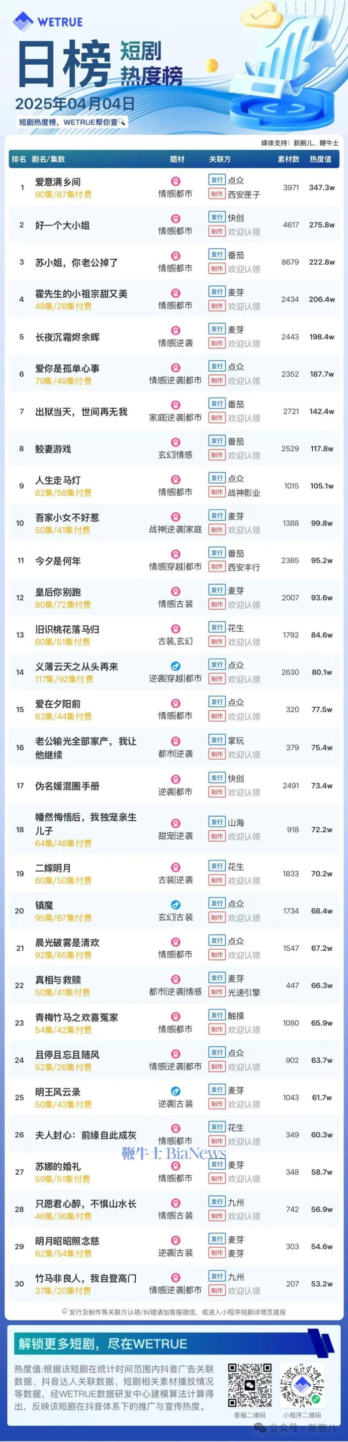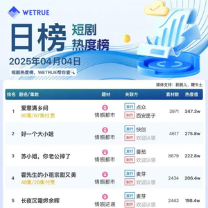 1、本日榜为WETRUE短剧数据公司提供,新腕儿和鞭牛士提供联合支持。