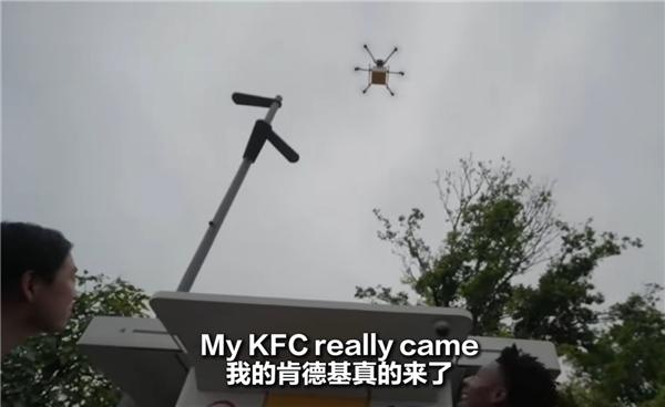 从直播画面来看,甲亢哥通过无人机拿到了肯德基外卖。