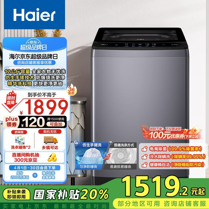 海尔XQB120-BSE629变频波轮洗衣机12kg大容量京东特惠1879元