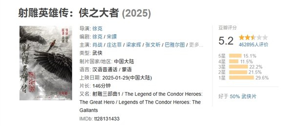 截稿前,《射雕英雄传:侠之大者》豆瓣评分为5.2分,超46万豆瓣用户打分。