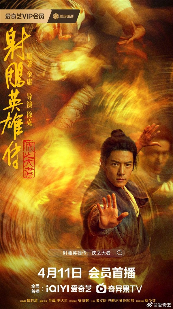 快科技4月7日消息,今日,肖战领衔主演的《射雕英雄传:侠之大者》官宣网播定档4月11日,将在优酷、腾讯视频、爱奇艺、芒果TV四大平台同步上线,预计会员可免费观看。