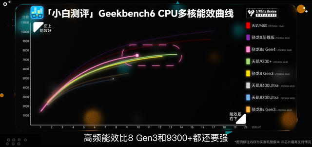 从小白测评的跑分数据深入剖析,骁龙8s Gen4 的 CPU 性能优势显著。Geekbench6 测试结果显示,单核成绩 2232 分,实现了对上代约 10% 的提升,在与天玑8400 的竞争中,领先幅度高达约 35%。多核成绩 7308 分,紧逼 8Gen3,相比上代 8s Gen3 更是提升约 30%,其独特的 “1 超 7 大”核心CPU设计功不可没。在 CPU 能效方面,GB6 多核峰值达到 7468 分,从能效曲线来看,除两款顶级旗舰 SoC 外,它在高频能效上超越 8Gen3 和 9300+,领先天玑8400,并且功耗相较于 8s Gen3 大幅降低近半,能效领先 8400 约 20%,这意味着在日常使用中,搭载骁龙8s Gen4 的手机能在保持高性能的同时,有效减少电量消耗,延长续航时间。