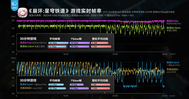 极客湾的测试进一步揭示了骁龙 8s Gen4 在游戏方面的潜力。在《原神》864P 下须弥城跑图测试中,整机功耗 6.3W,略好于搭载 8 Gen 3 的 Ace3 Pro,在保证高帧率的同时,功耗控制更为出色。《崩坏:星穹铁道》匹诺康尼 755P 分辨率下,平均帧率 51.5 帧,虽屏幕功耗较高,但总体能效和上代旗舰相近,帧率表现优于 Ace3Pro 和 X100。《鸣潮》718P 分辨率下,平均帧率 50.1 帧,整机功耗 7.4W,能效与 8 Gen 3、9300 机型相近,能够为玩家提供稳定的游戏体验。