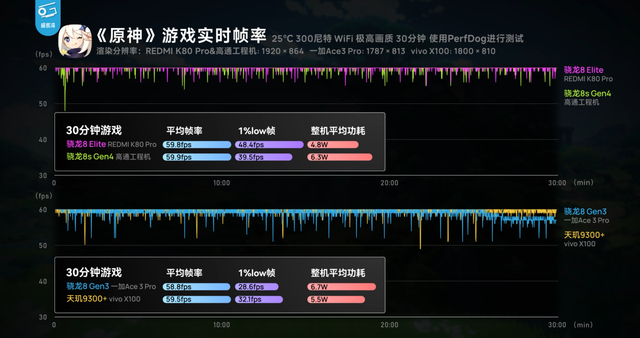 跑分成绩的优异为游戏性能奠定了坚实基础。在《王者荣耀》数据库 4.5 长时间游戏场景测试中,搭载骁龙8s Gen4 的工程机表现惊艳,帧率稳定在 119.1 帧,超越 8Gen3、8400 和 8sGen3 机型。相同功耗下,帧率比上代提升约 20%,这使得玩家在激烈的团战中也能感受到丝滑般的流畅操作,技能释放更加精准,游戏体验得到极大提升。《原神》数据库 4.5 测试中,游戏全程平均帧率达到 59.6,虽有小波动但始终贴近 60 帧,功耗仅 5.9W。相比 8400 和 8s Gen3,表现更为出色,与 8Gen3 相当,玩家能够在精美的开放世界中自由探索,享受高帧率带来的流畅视觉体验。《崩坏:星穹铁道》超高压场景下,工程机平均帧率 50.6 帧,接近 8Gen3 机型,比 8400 和 8sGen3 都要好,功耗也与 8Gen3 相近,在高负载游戏场景中展现出了良好的性能稳定性。