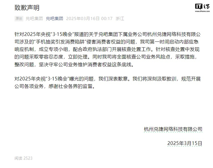 兑吧集团 3 月 16 日在公众号发布致歉声明,称已启动内部应急响应机制,成立专项小组,配合政府执法部门开展核查处置工作。针对核查处置中发现的问题采取零容忍态度,立即处理。同时该公司将全面核查公司业务风险点,采取措施,整改问题,将坚决守牢公司业务维护消费者权益这条底线。