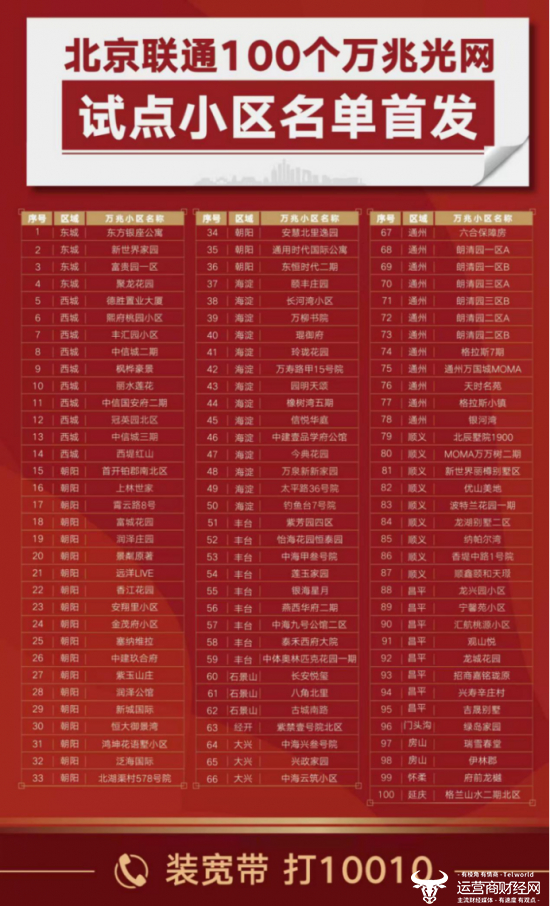 北京这100个小区能率先安装万兆宽带!联通公布了首批小区名单