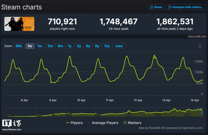 IT之家 4 月 14 日消息,SteamDB 数据库显示,V社旗下《反恐精英 2(CS2)》在 Steam 平台上的同时在线玩家数量(日活量)峰值现已达到 1862531(186.2 万),创下了新的纪录。