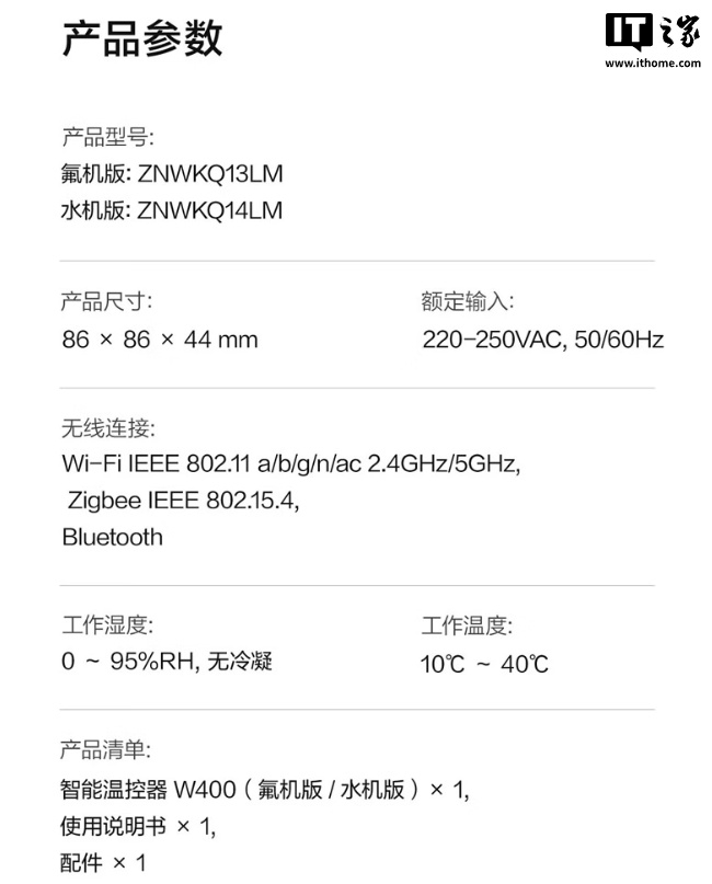 IT之家附绿米 Aqara 智能温控器 W400 产品参数如下: