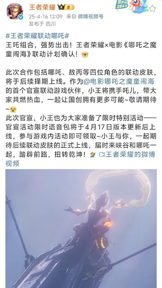 新浪科技讯 4月16日下午消息,今日,王者荣耀官方微博表示,王者荣耀将与电影《哪吒之魔童闹海》进行联动。