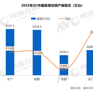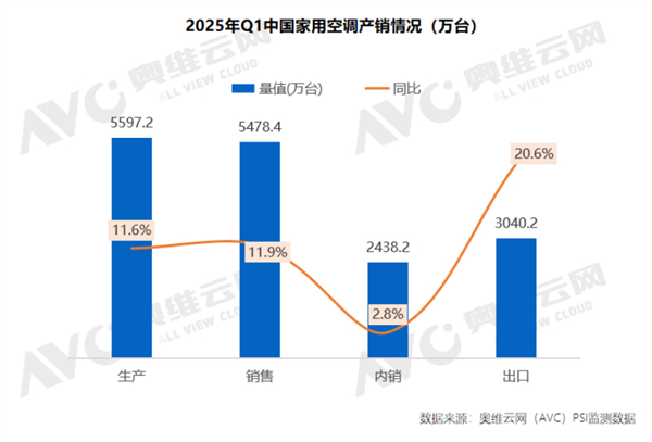 进一步细分来看,内销市场表现相对平稳,一季度内销空调2438.2万台,同比增长2.8%;而出口市场则展现出强劲的增长势头,出口量高达3040.2万台,同比增长率达20.6%。