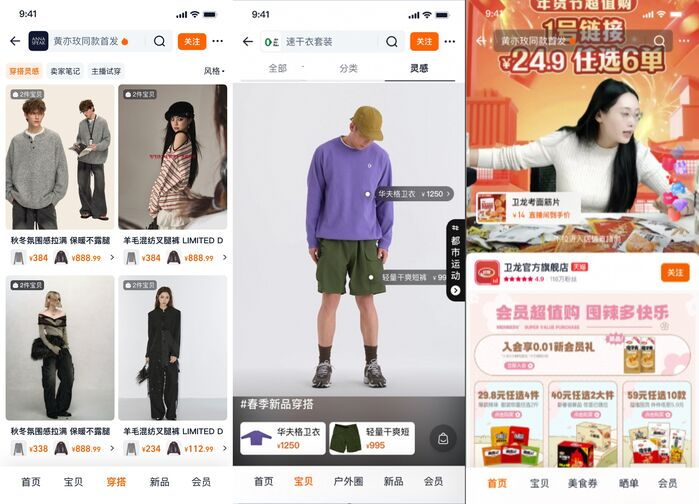 另一边,运动户外行业的店铺会显示圈子或店播。这类店铺此前“穿搭”里的内容将收录到灵感/攻略子tab中,位于店铺宝贝tab页面的上方。(主营大类为运动潮流-户外鞋服-跑步-健身-水上-冰雪叫灵感;主营大类为骑行登山露营垂钓叫攻略。)此外,家装及少量大家电行业的店铺下方会有门店tab;食品行业的店铺下方会有美食券tab。