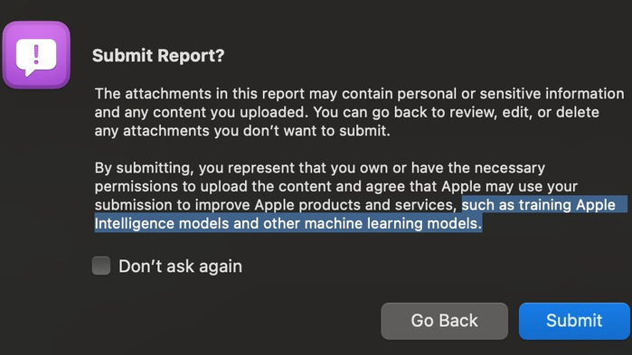 不过,若用户在 iOS 测试版中报告 Bug,则必须同意苹果使用上传内容进行 AI 训练,且无法选择退出。此举引发部分开发者的不满,他们批评苹果未提供退出选项,并将相关条款隐藏在隐私通知中。