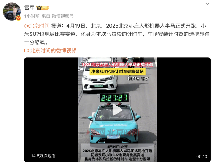 今日早间,小米创始人、董事长兼CEO雷军在微博上分享了小米SU7化身马拉松的计时车的相关视频。