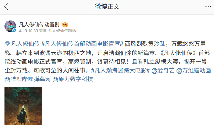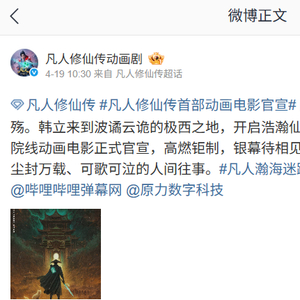 IT之家 4 月 20 日消息,《凡人修仙传》动画连续剧官方微博昨日发文宣布,其首部院线动画电影《凡人修仙传之瀚海迷踪》“高燃钜制,银幕待相见”。