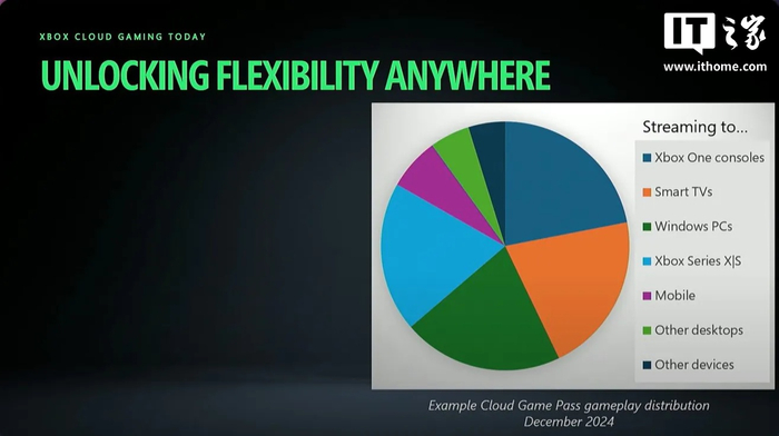 微软最近还在 YouTube 上发布了一场针对 Xbox 云游戏的 GDC(游戏开发者大会)会议内容,展示了 2024 年 12 月期间使用该服务最多的平台分布图。其中,Xbox One 以 21.9% 的使用率位居榜首,智能电视(21.1%)和 PC(20.8%)紧随其后,Xbox Series X|S 的使用率为 19.4%,移动设备为 6.7%,其他设备占比较小。