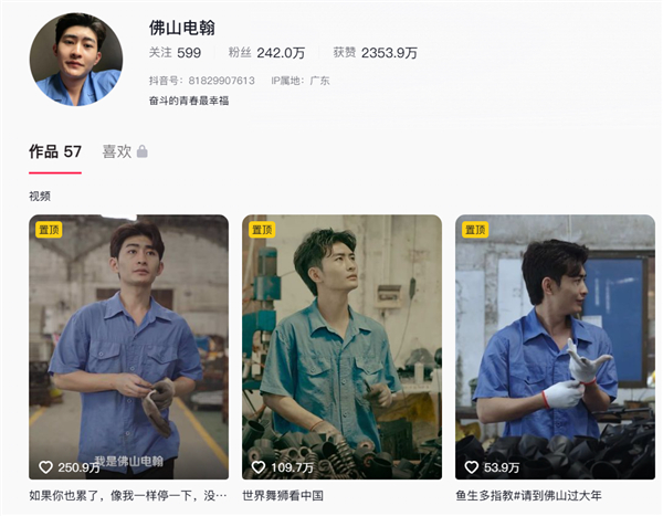 据了解,“佛山电翰”因长相酷似演员张翰,在工厂直播打螺丝的甩手和整齐划一的动作走红网络,10天涨粉近百万。
