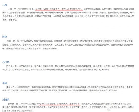 目前,在太保产险官网之上,刘增波的职务已变为副总经理、财务负责人、董事会秘书。但是,与他同期上任的石践职务尚未变动,依旧是临时合规负责人。