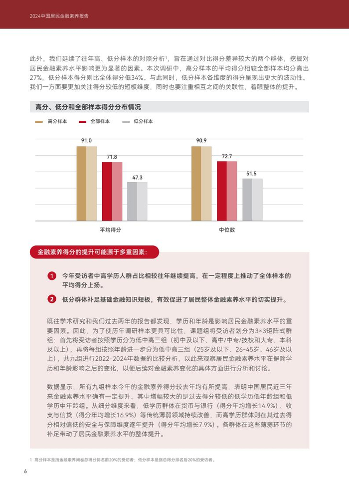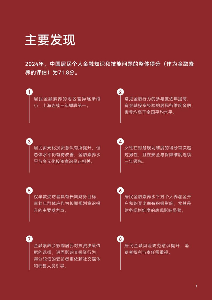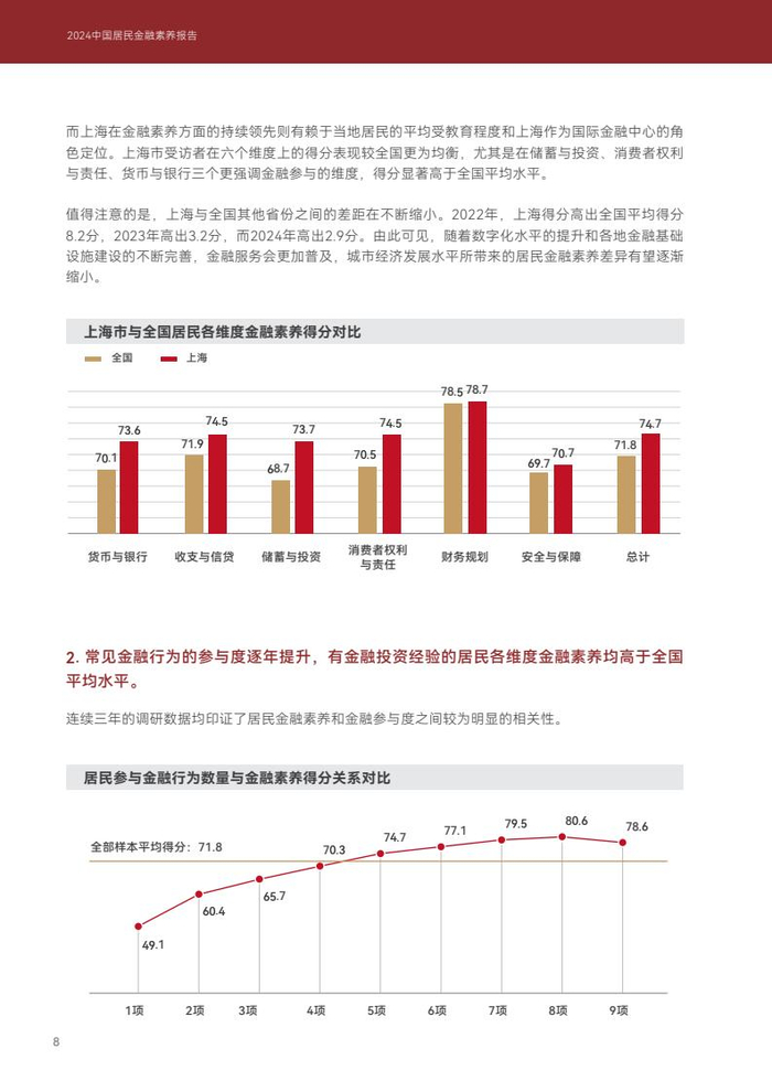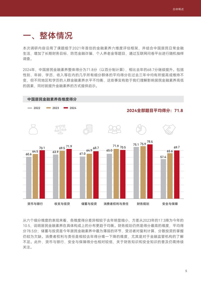2024年,中国居民个人金融知识和技能问题的整体得分(作为金融素养的评估)为71.8分。