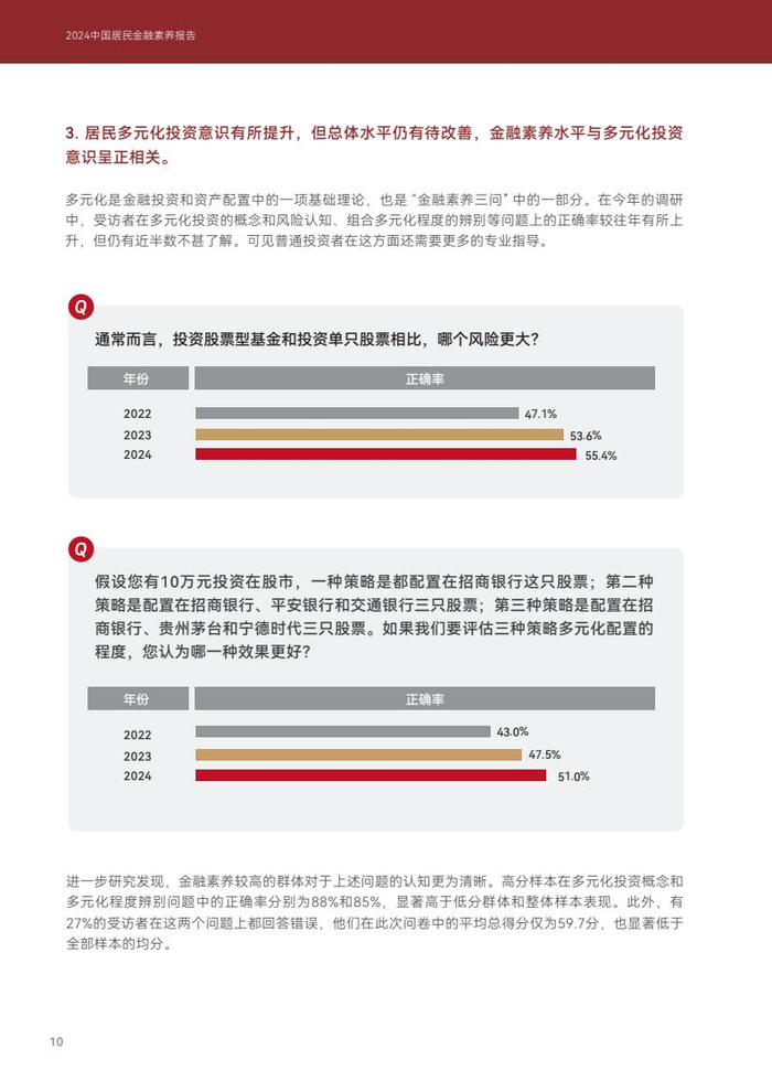 居民多元化投资意识有所提升,但总体水平仍有待改善,金融素养水平与多元化投资意识呈正相关。