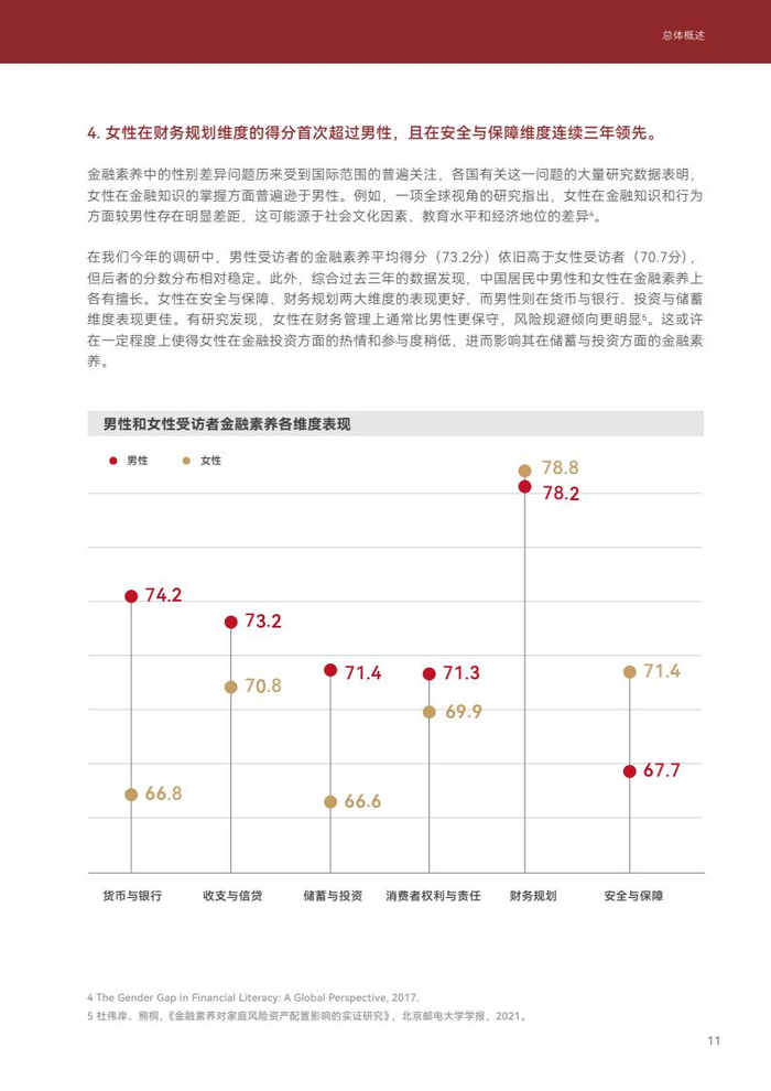 女性在财务规划维度的得分首次超过男性,且在安全与保障维度连续三年领先。