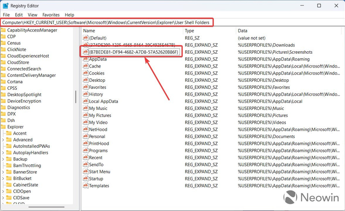 按 Win + R 键输入“regedit”打开注册表编辑器,导航至“Computer\HKEY_CURRENT_USER\Software\Microsoft\Windows\CurrentVersion\Explorer\User Shell Folders”指定路径,找到 {B7BEDE81-DF94-4682-A7D8-57A52620B86F} 值并修改为新文件夹路径(如 D:\Screenshots)。注意,此方法不会自动移动现有截图。操作需谨慎,确保数据安全。