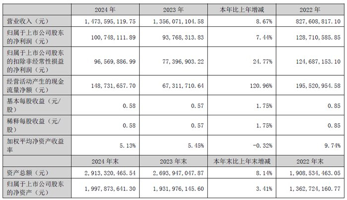 报告期内,深圳市汇创达科技股份有限公司实现全年营业收入和利润微幅上涨,2024 年实现营业收入14.74亿元,同比增长8.67%;实现归母净利润10,074.81 万元,同比增长7.44%。