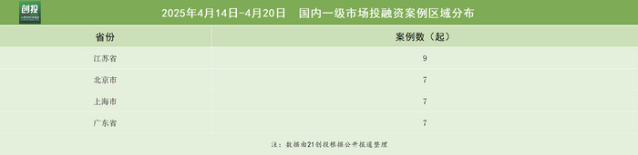从披露获投企业的地域分布来看,本周的融资地区主要集中在江苏省、北京市、上海市和广东省,分别完成9笔、7笔、7笔、7笔融资。