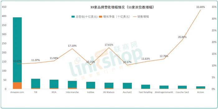 (1)33家企业中,营收双位数增长的有11家。增幅最为突出Action,2024年榜单数据为112.2亿美元,2025年达到150亿美元,增长33.7%;其次为Couche-Tard,营收增幅21%;排名第二的亚马逊,营收也获得10.7%的双位数增长。